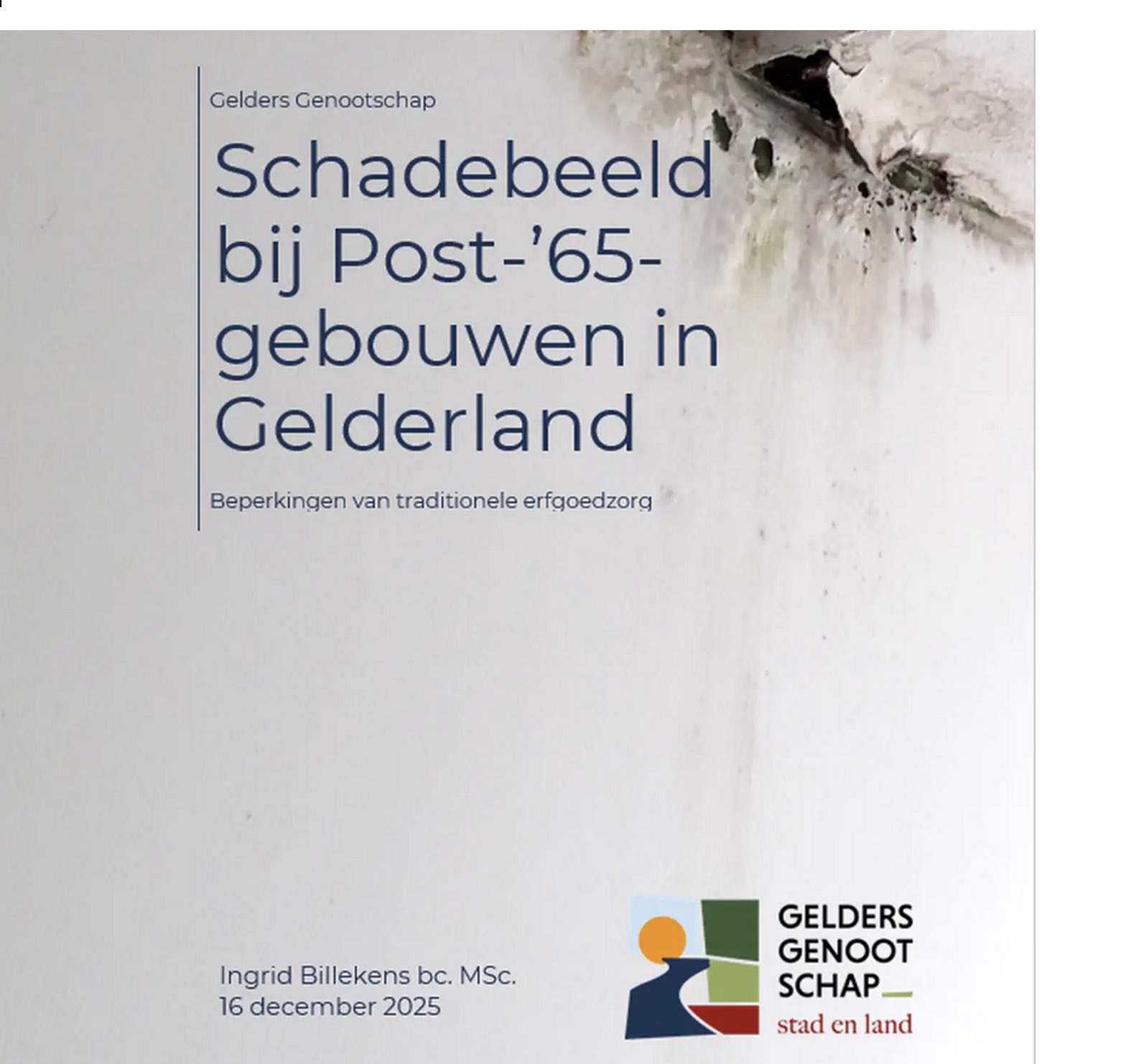 Schadebeelden bij Post ’65 gebouwen Het Gelders Genoodschap heeft een verslag uitgebracht van het onderzoek dat Ingrid Billekens heeft gedaan naar schadebeelden bij Post65 objecten aan de hand van twee Gelderse casussen. Vanaf de jaren zestig veranderde de Nederlandse bouw ingrijpend en werden nieuwe materialen, vereenvoudigde detailleringen en versnelde bouwmethoden leidend. Haar conclusies dwingen tot een nieuwe benadering, want met een te rigide toepassing van de restauratieladder geef je dit erfgoed niet zomaar een goede toekomst.